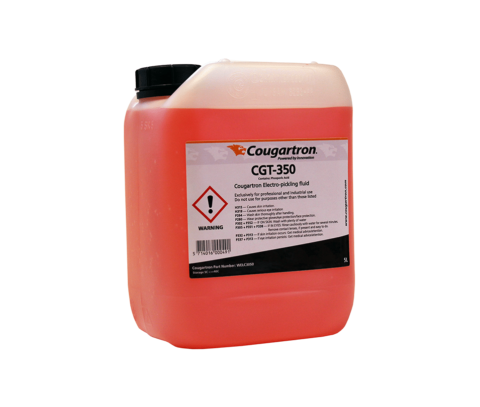 Note: CGT-350 is not suitable for electropolishing – This activity requires the use of our Cougartron CGT-550 weld cleaning and polishing fluid – WELC3048