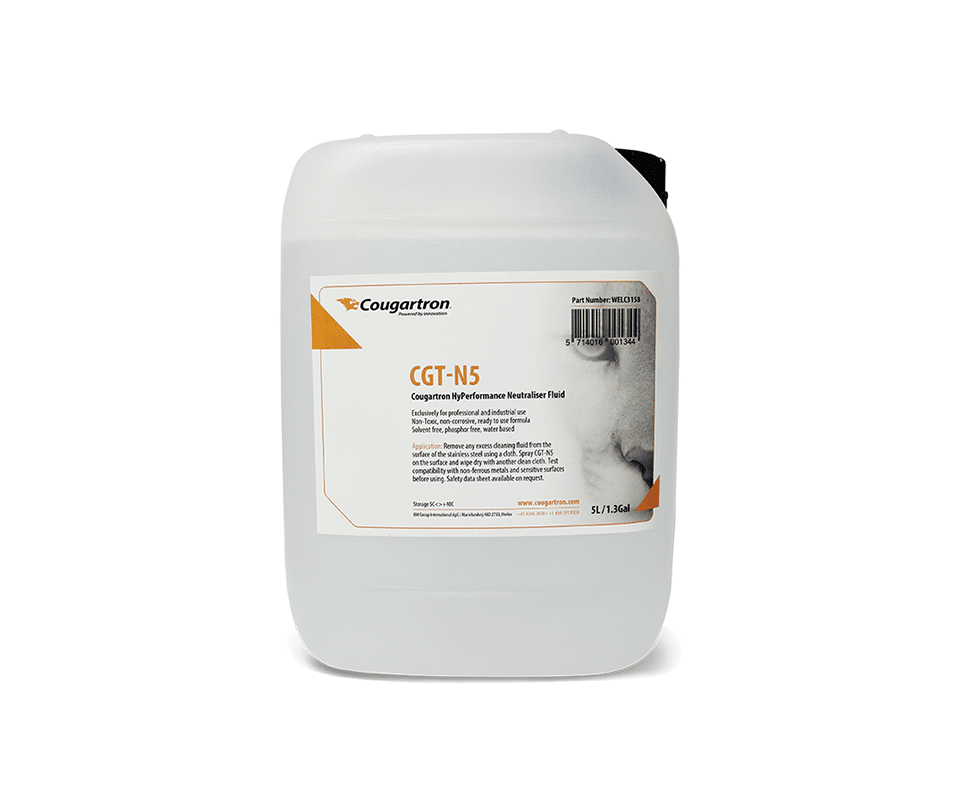CGT-N5 will successfully remove acid residue from steel surfaces and prevent the (re) appearance of annoying white marks after weld cleaning, electropolishing, or marking process.