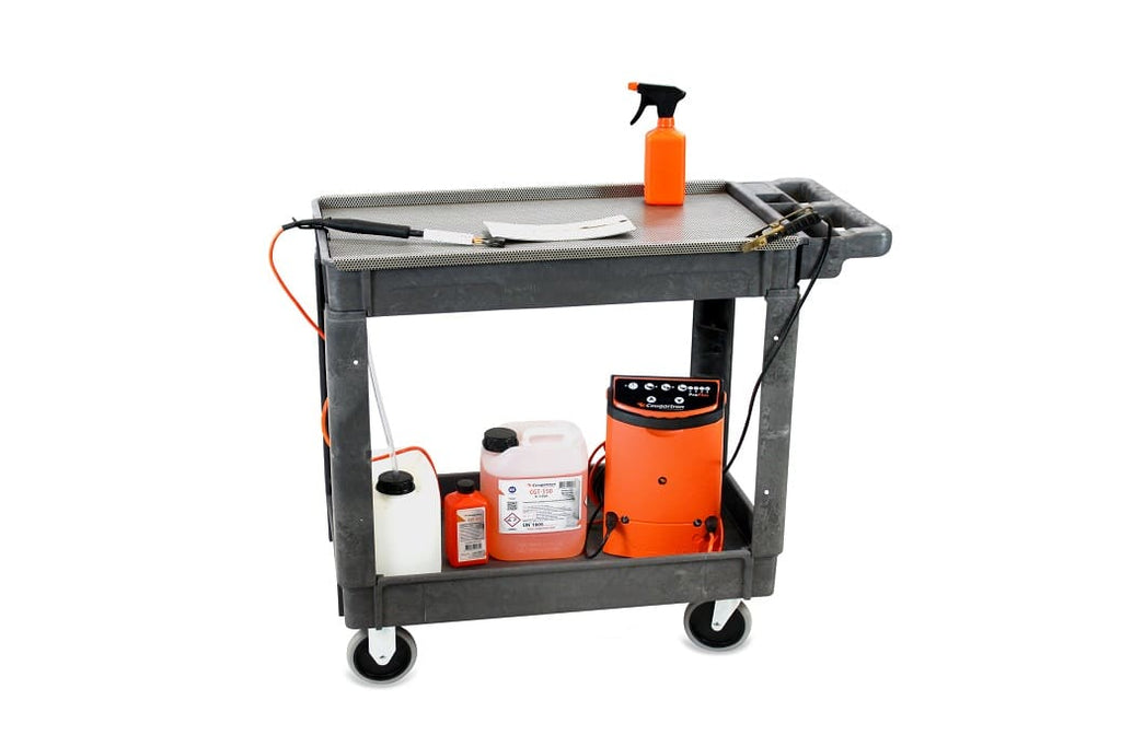 Cougartron WELC2889 Mobile weld cleaning workstation practical and mobile workstation for weld cleaning, passivation, and polishing. With its integrated fluid collection, tool holder, and a large work area, it makes your weld cleaning much easier and more flexible.
