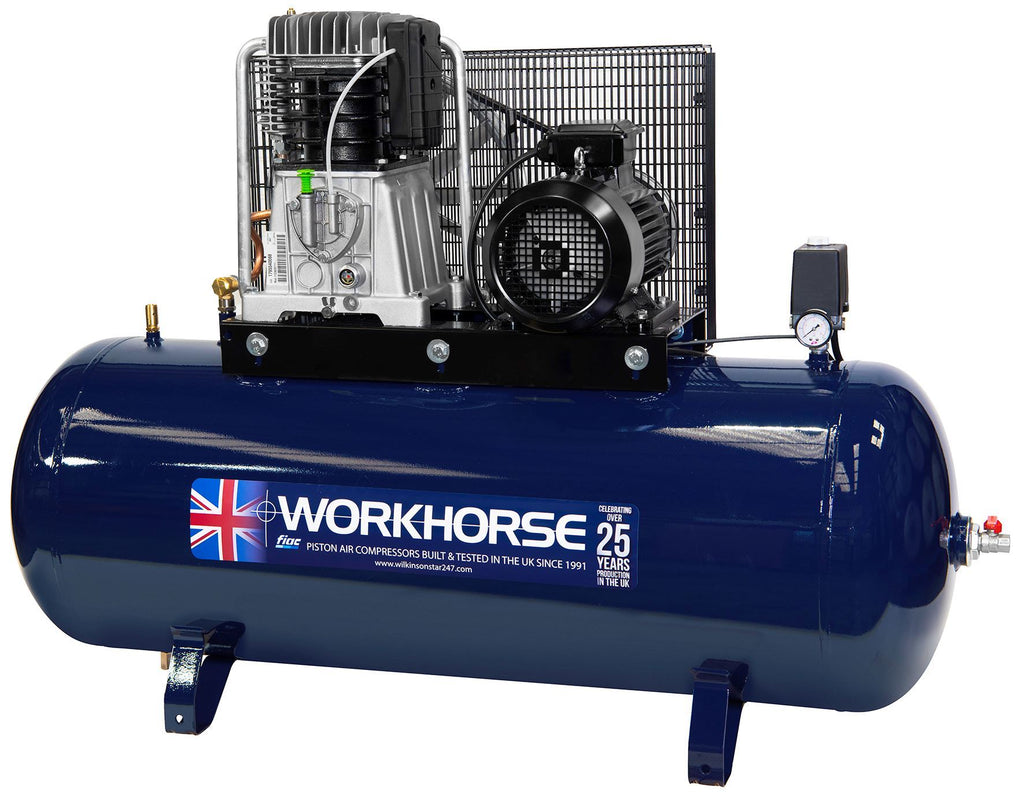 The WRN 10HP – 270S is a three phase 400V air compressor by Workhorse, featuring a cast iron cylinder block. This static air Compressor features a 10 Horse Power motor, 270 Litre Air Receiver, with a maximum of 29 Cubic Feet per Minute. This Fiac Workhorse compressor is backed by a 2 year on site warranty.