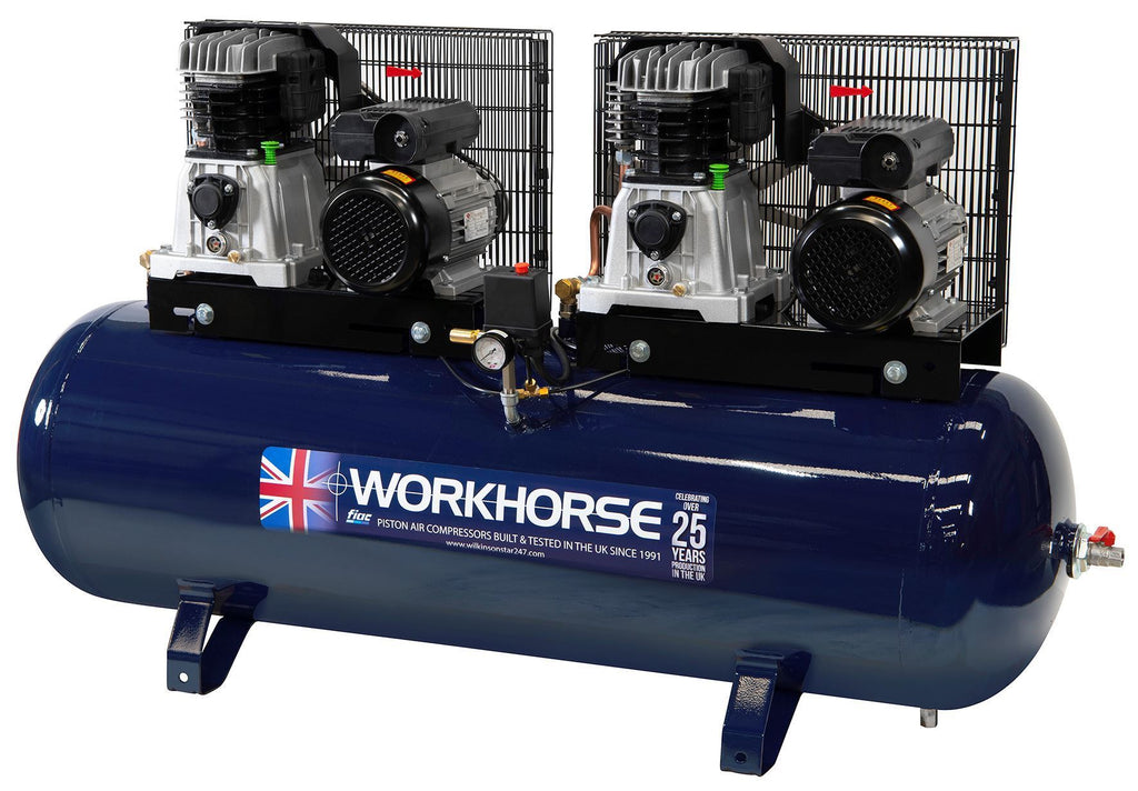 Workhorse Tandem Compressor 2 x 3HP - 230v - 250 Litre The WR Tandem 3HP – 250 is a single phase 230V air compressor by Workhorse, featuring a cast iron cylinder block. This static air compressor features a 250 Litre Receiver and twin pumps producing 21 cubic feet per minute (Free Air Delivery).
