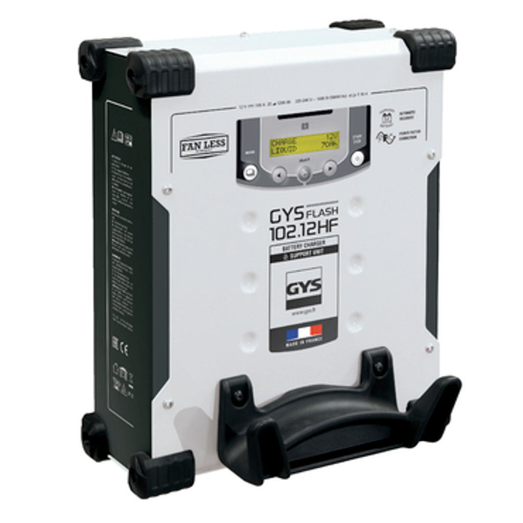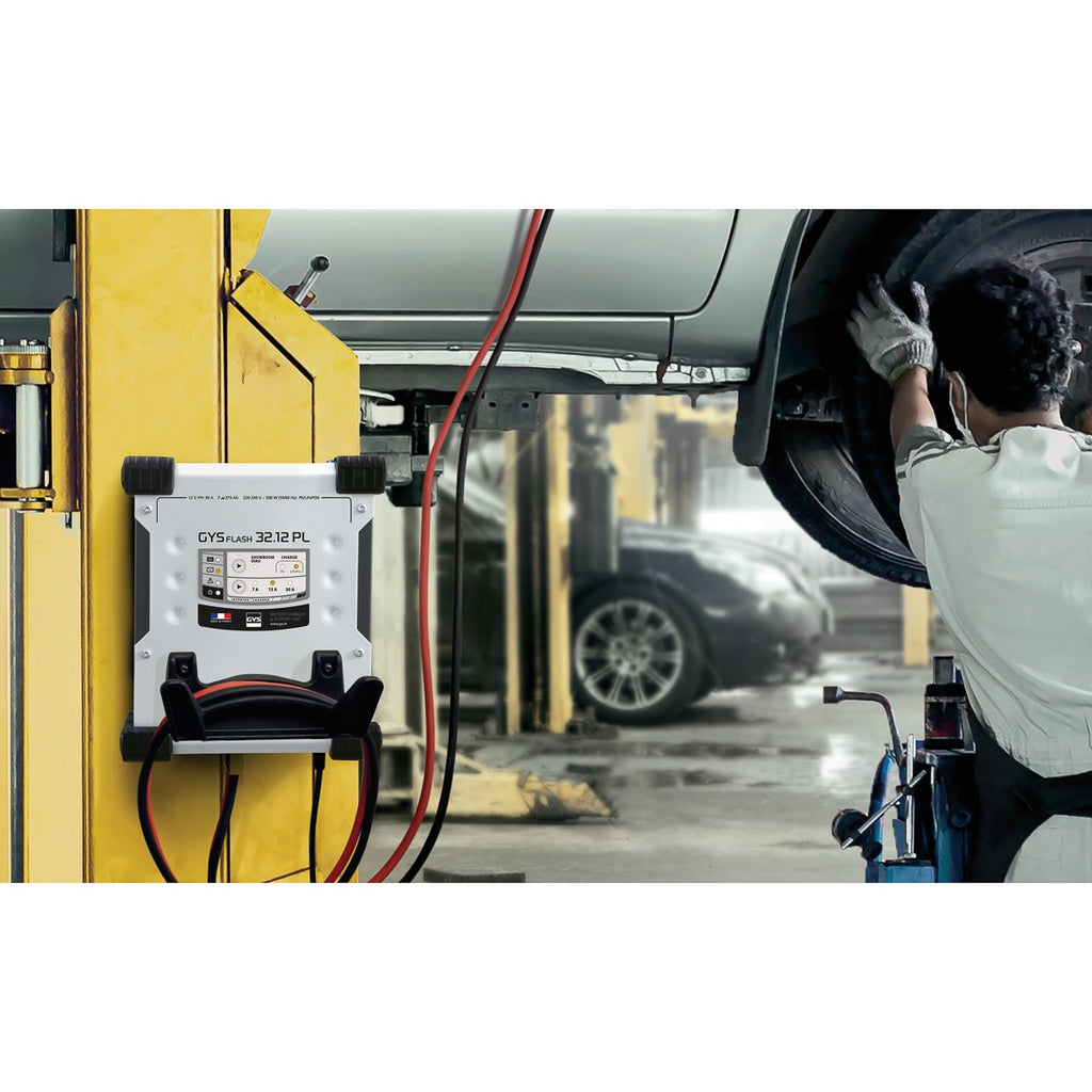 Specifically designed to be fitted on a wall or on a car lift, the vertical GYSFLASH 102.12 is a very powerful inverter battery charger able to supply up to 100A.. The GYSFLASH 102.12 will keep the battery’s voltage perfectly stable at 12V during the diagnostic phases. It will deliver the best charging cycle recommended for the maintenance of the most advanced vehicles on the market.