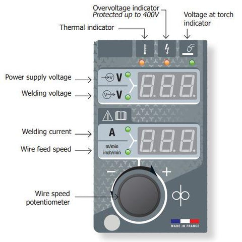 A clear to view display shows wire feed speed and voltage settings and amperage is displayable whilst welding.
