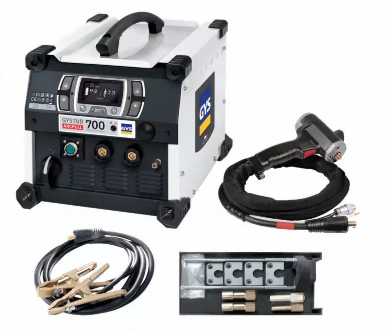 The ARCPULL 700 is a three-phase inverter arc welder for welding attachments (studs, internally threaded studs, insulation nails, pull rings, rivet extraction rods, etc.) to aluminium or steel-based materials.