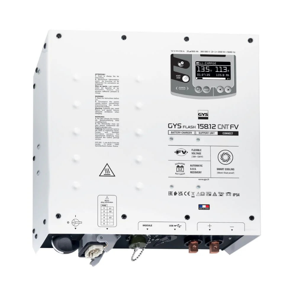 The GYS GYSFLASH 158.12 CNT FV is a state-of-the-art battery support unit designed for professional automotive applications. This powerful device offers a maximum output of 150A, making it suitable for a wide range of vehicles including cars, vans, and trucks. It features flexible voltage technology (FV), allowing operation on both 110V and 230V power networks.