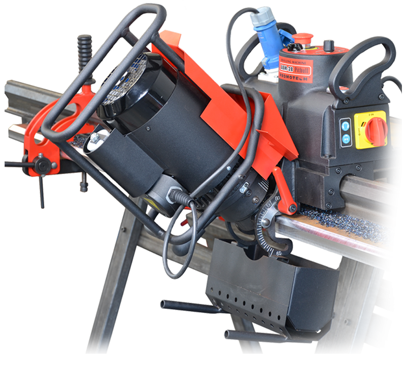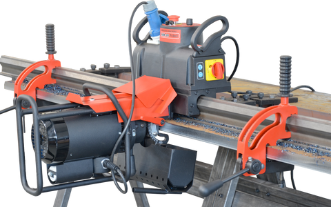 Simple start-up auto feed, which runs without the assistance of an operator. Continuous adjustment bevel angles between 60° and -60°, eliminating the need to turn the plate over. Maximum bevel width (depending on the angle) from 28 to 35mm. Variable feed control for work on a variety of steel grades and thicknesses (up to 35mm as standard or optionally up to 70mm). Bevelling in both travel directions. Motor overload protection. J-groove bevelling option available. Optional extendable rails.