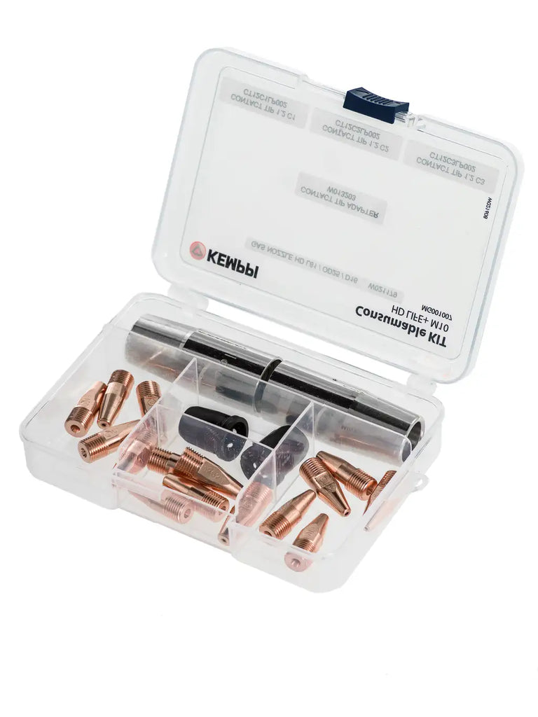 The Flexlite MIG Consumable Kit includes the most common consumables for 1,2mm wire for contact tips with M10 thread and OD25 gas nozzle. Select the clearance size according to the welded material: C1 is recommended for Ferrous wire, C2 for Stainless wire, and C3 for Aluminium wires. The consumables are packaged within a sturdy, reusable case, which can be used to store all the essential consumables for Flexlite MIG welding guns. HD kit with LIFE+ contact tips and heavy-duty gas nozzles are especially used in high amperage range and long duty cycle welding applications. HD gas nozzles include nickel coating and thicker walls. Nickel coating makes it easier to remove spatters. Thicker walls have more durability.