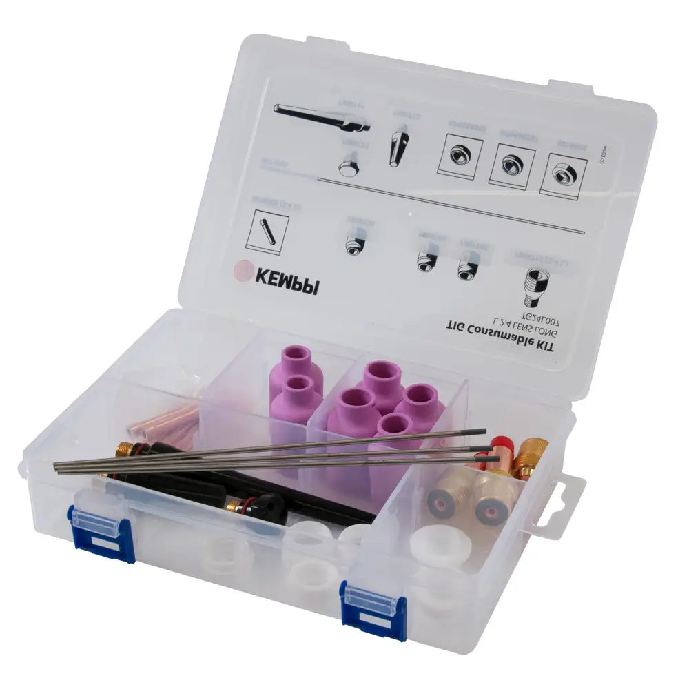 The Kemppi Flexlite Large TIG Consumable Kit (2.4mm Lens, Long) with reference number TG24L007 is a TIG welding consumable kit for Flexlite large TIG torches. It is designed for use with a 2.4mm lens and features long consumables for extended reach.