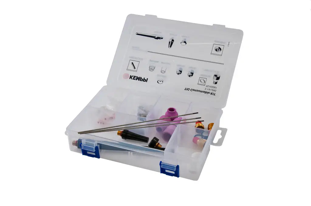 The Kemppi Flexlite Large TIG Accessory Pro Kit (3/8-32) W016086 is a consumable starter kit for TIG welding with larger torch bodies. It includes the necessary nozzles, collets, and other accessories to help you get started.