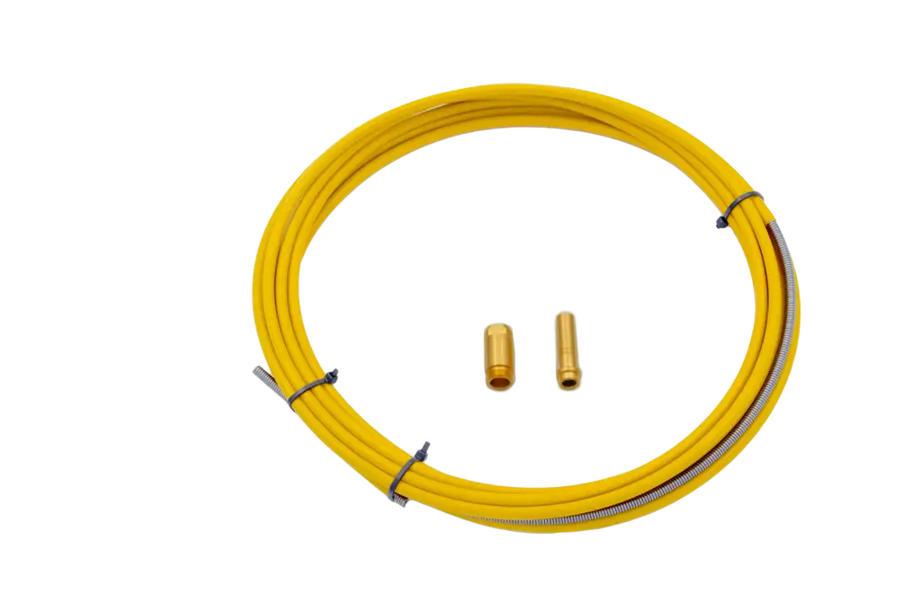 The Kemppi W021065 steel wire liner is a 6-meter long yellow spiral wire liner for feeding ferrous (Fe) steel wire with a diameter of 1.2 to 1.6 mm. It has an outer diameter of 5.8 mm and an inner bore of 2.4 mm.