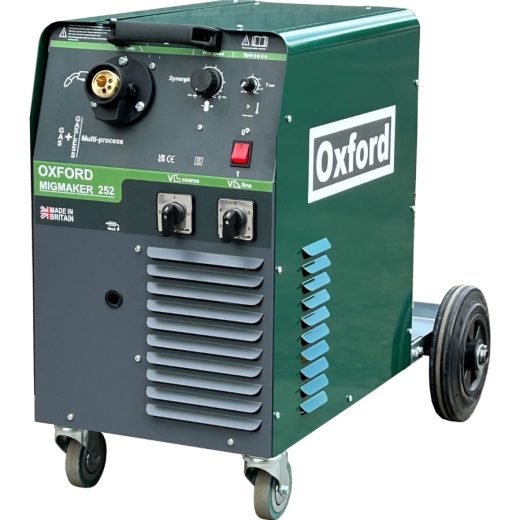 The Oxford MIGMAKER 252 is a single phase 250A step regulated MIG welder made by British welding machine manufacturer Oxford. Updated for 2025, the MIGMaker 202 still offers the same robust British built build quality as before, but now has a more electrically efficient transformer to comply with latest regulations. Reverse polarity now comes with these machines as standard meaning gasless wire can be used if required. Spot Timer now also included FOC.