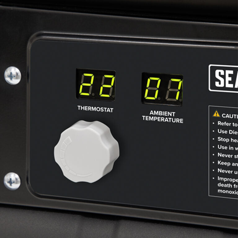 A specially designed burner head in a stainless steel combustion chamber ensures a more thorough burn of fuel which means greater fuel economy and maximum heating effect. Features include a digital room temperature (°C) display/error code readout, spare parts storage compartment and heavy-duty pneumatic wheels. Fitted with a flame-out device which cuts the fuel supply when the flame is inadvertently extinguished.
