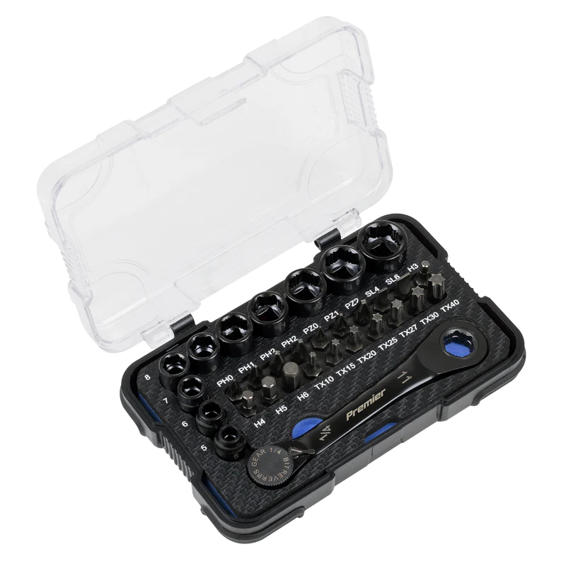 - 31PC SET - Includes sockets, bits and a double end, flip reverse ratchet spanner.