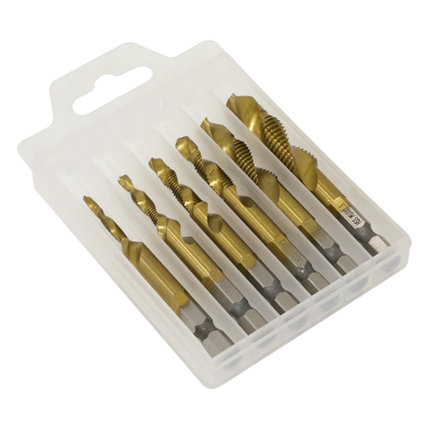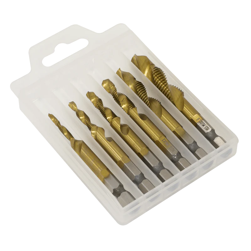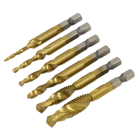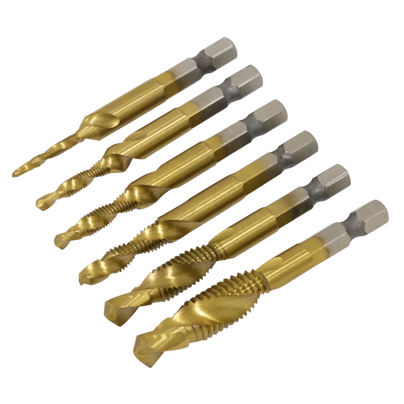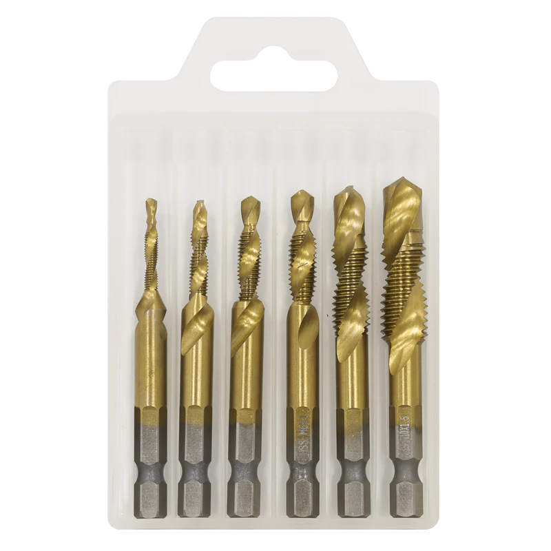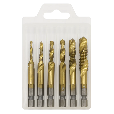 Threaded taps with drilling function, used to drill holes and cut new treads at the same time. Manufactured from HSS alloy steel with nitriding surface finish. Set Includes 6 Standard metric thread / pitch: M3 x 0.5, M4 x 0.7, M5 x 0.8, M6 x 1, M8 x 1.25, M10 x 1.5 For hand drill or lathe use. Supplied in a sturdy storage case.