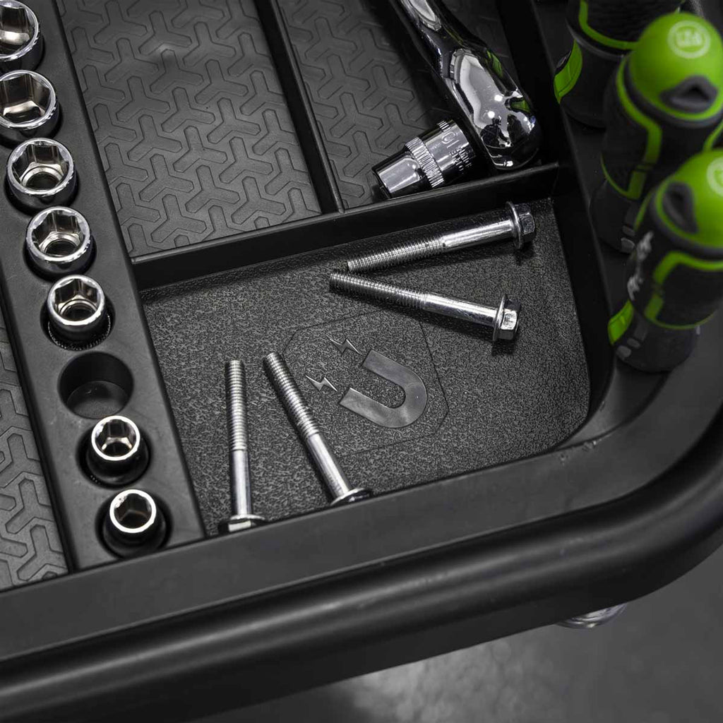 - stay organised - features two magnetic collection trays, two small tool storage sections, one large section for main workpiece as well as nine screwdriver storage holes and 15 socket storage slots.