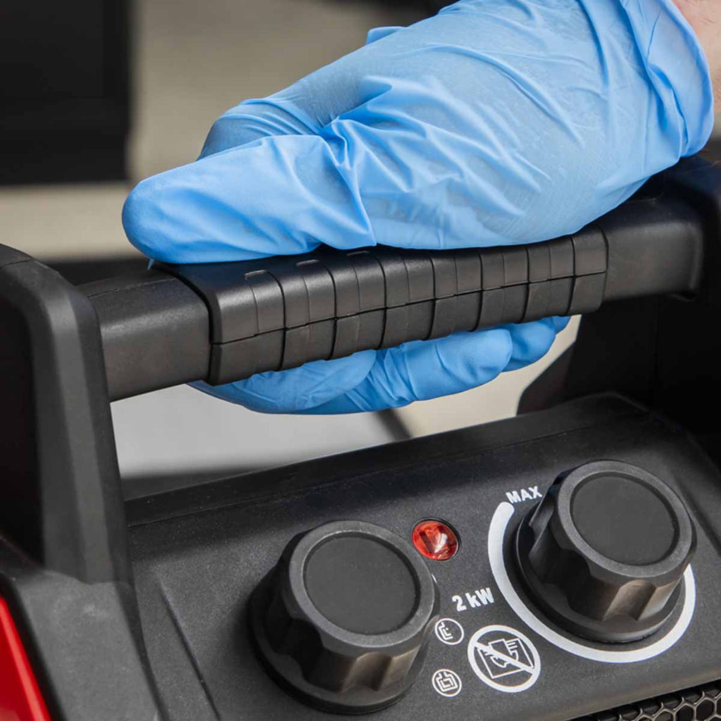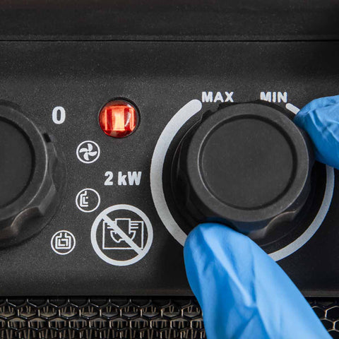 Portable industrial heater with a fan only and two heat settings. Features PTC heat conducting ceramic elements to achieve an instant, odour-free heat. Thermostat control to maintain ambient temperature. Includes overheating protection, protecting the user, product and environment.