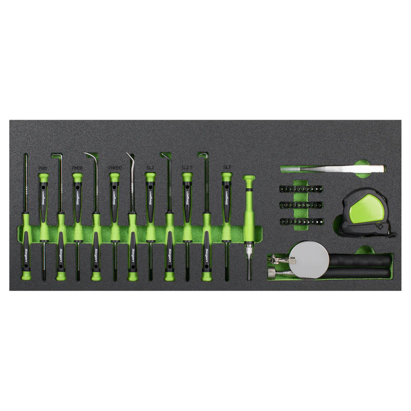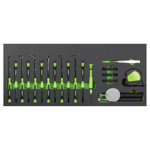 | Drawer 2: | Precision Screwdrivers; Phillips - #0, #00, #000, Slotted - 2, 2.5, 3mm, Pick and Hooks; Straight, Right Angle, Half-Round, Swan Neck, 45°/90° Tip, 40°/45° Tip, Ø50mm Inspection Mirror, 2.2kg Magnetic Pick-Up Tool, 3m Tape Measure, Tweezers, Precision Bit Driver with Extension Bar, Precision Bits; Slotted - 1, 1.5, 2, 2.5, 3, 3.5, 4mm, Phillips - #1, #0, #00, #000, Pozi - #0, #1, TRX-Star* - T4, T5, T6, T7, T8, T9, T10, T15, T20, Hex - 0.7, 0.9, 1.3, 1.5, 2, 2.5, 3, 4mm |