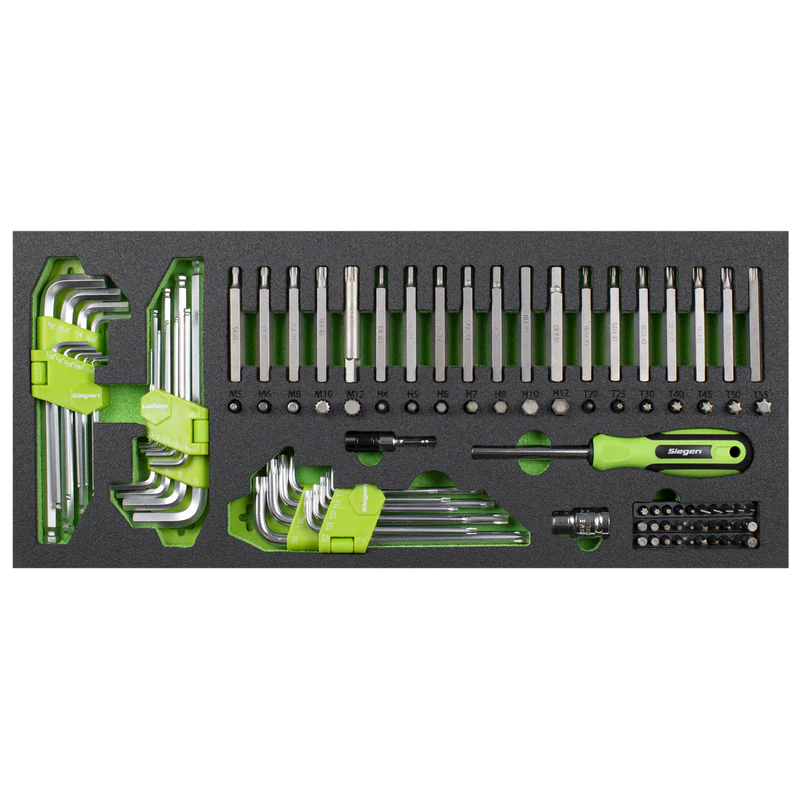 | Drawer 3: | Bits; TRX-Star* - T20, T25, T30, T40, T45, T50, T55 (1 each of 30 and 75mm), Hex – 4, 5, 6, 7, 8, 10, 12mm (1 each of 30 and 75mm), Spline - M5, M6, M8, M10, M12 (1 each of 30 and 75mm), Adaptors; 1/2"Sq Drive x 10mm Hex, Hex Keys; 1.5, 2, 2.5, 3, 4, 5, 6, 8, 10mm, TRX-Star* Keys; T10, T15, T20, T25, T27, T30, T40, T45, T50, Imperial Hex Keys; 1/16", 5/64", 3/32", 1/8", 5/32", 3/16", 1/4", 5/16", 3/8", 1/4" Hex Bits; Slotted – 3, 4,5, 6, 7mm, Phillips - #0 x 2, #1 x 2, #2 x 4, #3 x 2, Pozi - #0, #1, #2, #3, TRX-Star* - T10, T15, T20, T25, T30, Hex - 2, 3, 4, 5, 6mm, 25mm Adaptor, 60mm Quick Chuck Bit Holder, Bit Holder Handle |