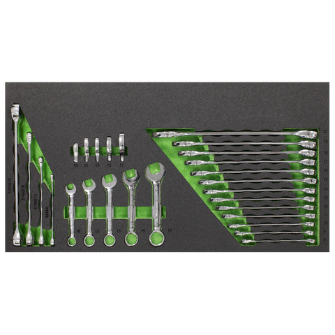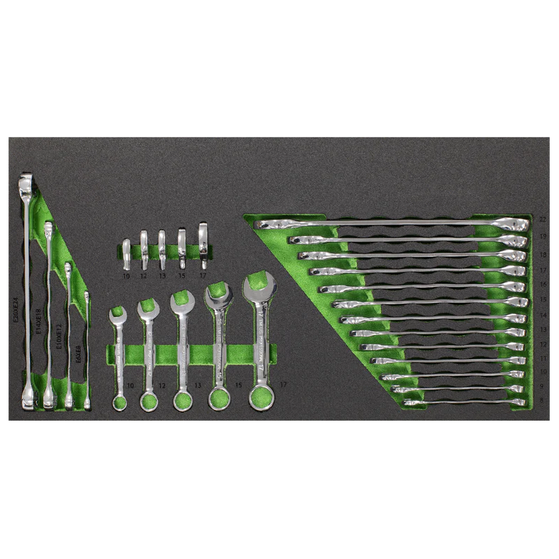 | Drawer 5: | Combination Spanners; 8, 9, 10, 11, 12, 13, 14, 15, 16, 17, 18, 19, 22mm, Stubby Combination Spanners; 10, 12, 13, 15, 17mm, TRX-Star* Spanners; E6 x E8, E10 x E12, E14 x E18, E20 x E24, 3/8"Sq Drive Crow’s Foot Spanners; 10, 12, 13, 15, 17mm |