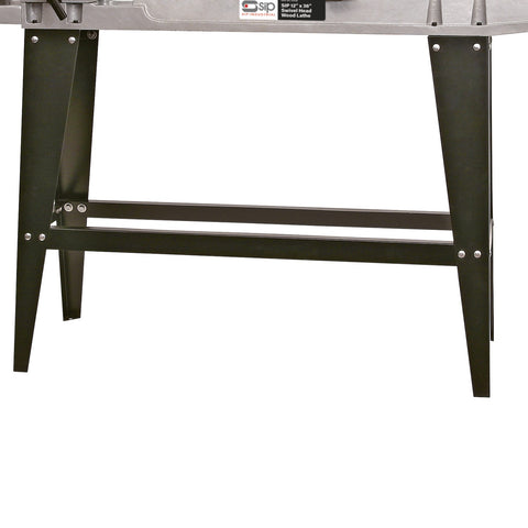- Pressed steel legs with cross braces and cast iron lathe bed