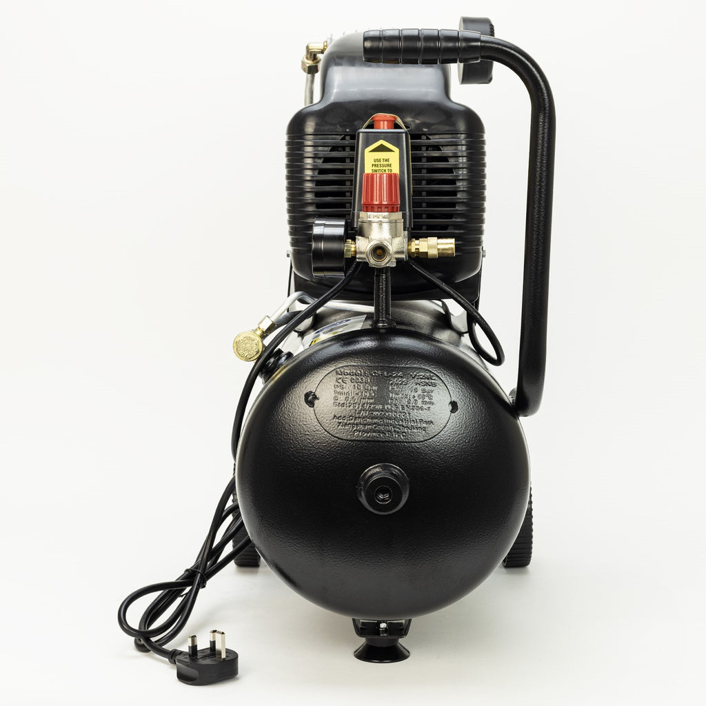 ITEM NO. 06457 Input Supply: 230v (13A) Motor Power: 2hp (1.5kW) Receiver Size: 24ltr Piston Displacement: 8.00CFM (227ltr/min) Free Air Delivery (FAD): 4.80CFM (136ltr/min) Max. Air Pressure: 116psi (8bar) Noise Level: 94dB(A) Net Weight: 23.75kg Gross Weight: 25.00kg Product Dimensions: Packaged Dimensions: 580(H) x 580(W) x 265mm(D)