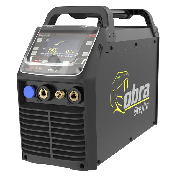Cobra by Stealth 250-3 LCD TIG Welding Machine. The Cobra by Stealth 250-3 LCD TIG Welding Machine. With a power supply voltage of 3-400V and a lightweight design of 13.6kg, this machine is perfect for precision welding jobs. Its easy arc striking feature and 4.3 inch LCD screen make it user-friendly, while boasting a high efficiency of 89.5%. Save and load your jobs with ease and take advantage of both TIG and MMA functions. Generator friendly for ultimate convenience.