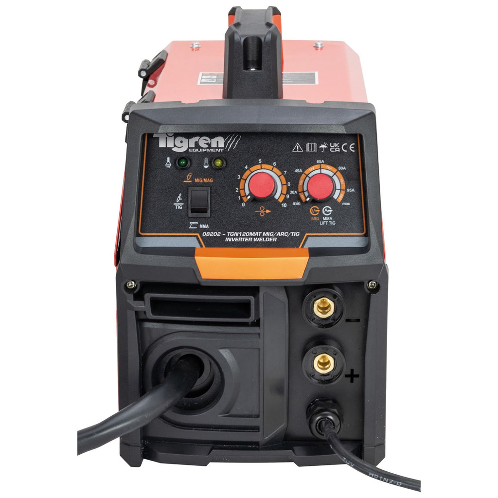 The TIGREN TGN120MAT MIG/ARC/TIG Inverter Welder is a versatile 4-in-1 machine offering powerful performance for Gas/Gasless MIG, ARC, and Lift-TIG welding processes, along with infinitely variable output for high versatility in each.