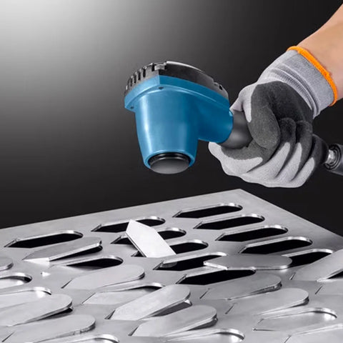 With the pneumatic part separator, the sheet metal composite is vibrated by impact pulses and the parts simply detach from the scrap skeleton. TruTool PS 100 is the perfect solution for separating nanojoint connections – machining is quick and easy. The part separator is also great for microjoint connections.With its compact design, the machine sits comfortably in the hand. The variety of holding positions on the machine head as well as on the handle means you can vary the holding position while you work. The result: an ergonomic and user-friendly mode of operation for efficient and fatigue-free work.